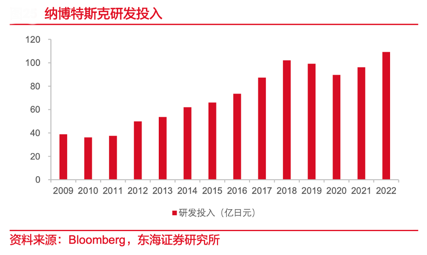 經(jīng)典案例:根據(jù)Bloomberg、東海證券研究所等綜合資訊表明,納博特斯克始終強(qiáng)調(diào)研發(fā),公司“Vision 2030”戰(zhàn)略規(guī) 劃中明確提出在增強(qiáng)現(xiàn)有產(chǎn)品競爭力的同時(shí)超前布局新一代產(chǎn)品。2022 年公司研發(fā)投入達(dá) 109.2 億日元,近五年累計(jì)研發(fā)費(fèi)用投入近 500 億日元,重點(diǎn)開發(fā)新一代精密減速器、自動(dòng) 門、飛行控制系統(tǒng)、鐵路運(yùn)輸設(shè)備等核心產(chǎn)品。