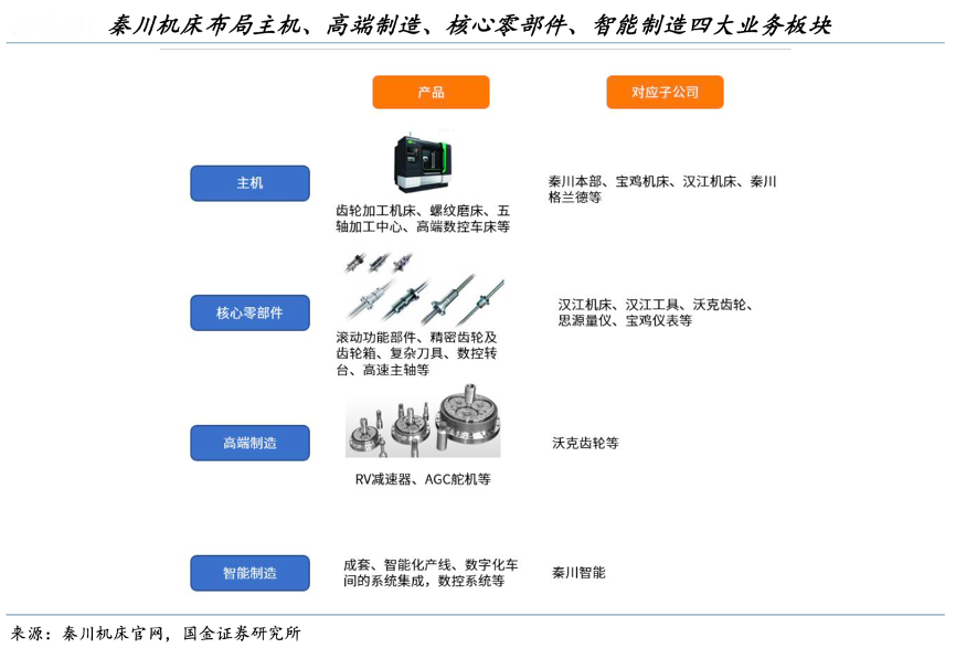 經(jīng)典案例:根據(jù)秦川機床官網(wǎng)、國金證券研究所等綜合資訊表明,秦川機床包含主機業(yè)務、高端制造業(yè)務、核心零部件業(yè)務、智能制造業(yè)務四大業(yè)務板塊, 產(chǎn)品包括高端數(shù)控車床、外圓磨床、齒輪加工機床、加工中心、滾動功能部件等,擁有寶雞機床、漢江機床、漢江工具、沃克齒輪等子公司。