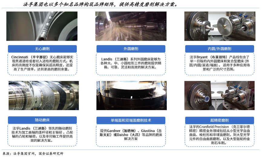 經(jīng)典案例:根據(jù)法孚集團(tuán)官網(wǎng)、國金證券研究所等綜合資訊表明,法孚集團(tuán)超精密設(shè)備事業(yè)部提供金屬切削、復(fù)合材料自動(dòng)化解決方案、磨削/超精密加工、 切削工具/磨具磨料等產(chǎn)品與服務(wù)。其磨床板塊下屬多個(gè)品牌,在汽車行業(yè)以其先進(jìn)的凸 輪軸磨削系統(tǒng)和曲軸磨削系統(tǒng)聞名,同時(shí)也在無心磨削、圓盤磨削和數(shù)控磨削工藝方面處于領(lǐng)先地位,其磨削的軸類零件廣泛應(yīng)用于各個(gè)行業(yè)。