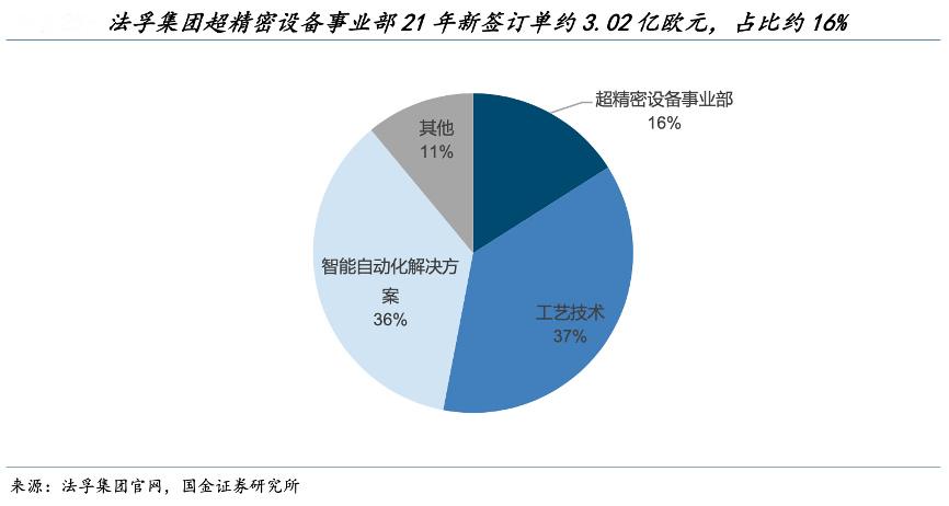 經(jīng)典案例:根據(jù)法孚集團(tuán)官網(wǎng)、國金證券研究所等綜合資訊表明,法孚集團(tuán) 21 年實(shí)現(xiàn)營業(yè)收入17.24億歐元,新簽訂單 18.89 億歐元,其中超精密設(shè)備事 業(yè)部(含金屬切削、復(fù)合材料自動(dòng)化解決方案、磨削/超精密加工、切削工具/磨具磨料等 多個(gè)子版塊)訂單占比約為 16%,對(duì)應(yīng)約 3.02 億歐元。