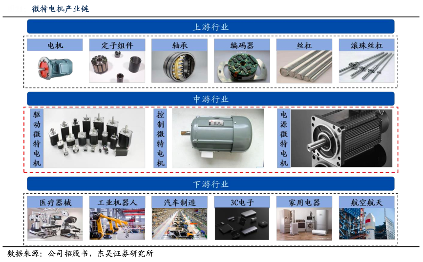 經(jīng)典案例:根據(jù)公司招股書、東吳證券研究所等綜合資訊表明,鼎智科技公司位于產(chǎn)業(yè)鏈中游,提供微特電機(jī)定制化解決方案。微特電機(jī)的功率一般在 750 瓦以下,機(jī)座外徑 不大于 160mm 或中心高不大于 90mm,是典型的機(jī)電一體化產(chǎn)品,被廣泛用于控制、驅(qū)動(dòng)領(lǐng)域。上游零部件原材料主要包括軸承、絲杠、定子組件等,成本受鋼材、銅材價(jià)格影響;下游應(yīng)用包括醫(yī)療器械、工業(yè)機(jī)器人、3C 電子等,應(yīng)用領(lǐng)域廣泛。