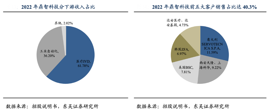 經(jīng)典案例:根據(jù)招股說(shuō)明書、東吳證券研究所等綜合資訊表明,醫(yī)療及工業(yè)自動(dòng)化為鼎智科技主要下游,其深度綁定國(guó)內(nèi)外大客戶。2022年醫(yī)療 IVD、工 業(yè)自動(dòng)化領(lǐng)域營(yíng)收占比分為達(dá) 61.8%、36.2%,為主要下游。2022年前五大客戶包括意、美、韓經(jīng)銷商,及國(guó)內(nèi)西安天隆、達(dá)安醫(yī)療等直銷客戶,CR5 達(dá) 40.3%,客戶集中度相 對(duì)較高,形成深度合作。