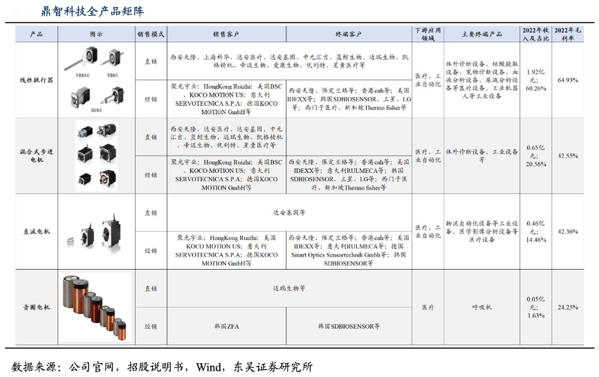經(jīng)典案例:根據(jù)公司官網(wǎng)、招股說(shuō)明書(shū)、wind、東吳證券研究所等綜合資訊表明,鼎智科技公司現(xiàn)已形成線性執(zhí)行器、混合式步進(jìn)電機(jī)、直流電機(jī)及音圈電機(jī)四大系列產(chǎn)品矩陣,其中線性執(zhí)行器為行業(yè)領(lǐng)先產(chǎn)品,呼吸機(jī)配套音圈電機(jī)打破國(guó)外壟斷,產(chǎn)品具備較強(qiáng)競(jìng)爭(zhēng)力。