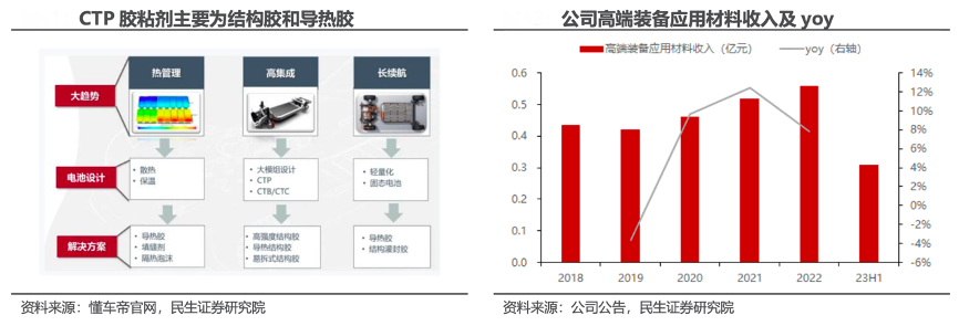 經(jīng)典案例:根據(jù)懂車帝、公司公告、民生證券研究院等綜合資訊表明,德邦科技公司高端裝備業(yè)務(wù)原有應(yīng)用領(lǐng)域主要為傳統(tǒng)燃油車市場(chǎng)、工程機(jī)械、礦山制造等,借助動(dòng)力電池膠業(yè)務(wù),公司開拓新能源汽車電機(jī)電控、軌道交通和車用結(jié)構(gòu)膠等領(lǐng)域應(yīng)用,客戶包括整車廠等,按照計(jì)劃逐步完成新產(chǎn)品開發(fā)與客戶群覆蓋。23H1 公司高端裝備應(yīng)用材料業(yè)務(wù)收入為 0.31 億元。