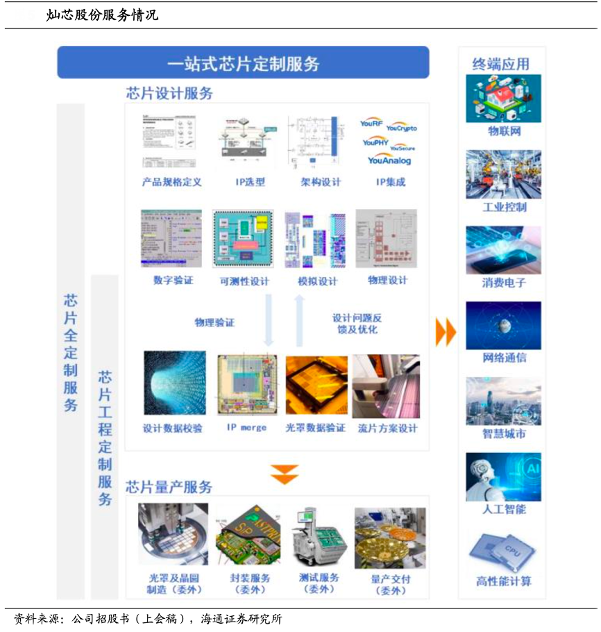 經(jīng)典案例:根據(jù)公司招股書(shū)(上會(huì)稿)、海通證券研究所等綜合資訊表明,燦芯股份公司基于自身全面的芯片設(shè)計(jì)能力、深厚的半導(dǎo)體 IP 儲(chǔ)備與豐富的項(xiàng)目服務(wù)經(jīng)驗(yàn),為客戶提供一站式芯片定制服務(wù),包括芯片定義、IP 選型及授權(quán)、架構(gòu)設(shè)計(jì)、邏輯設(shè)計(jì)、物理設(shè)計(jì)、設(shè)計(jì)數(shù)據(jù)校驗(yàn)、流片方案設(shè)計(jì)等全流程芯片設(shè)計(jì)服務(wù)。公司在為客戶提供芯片設(shè)計(jì)服務(wù)后,根據(jù)客戶需求可繼續(xù)為其提供芯片量產(chǎn)服務(wù)。
