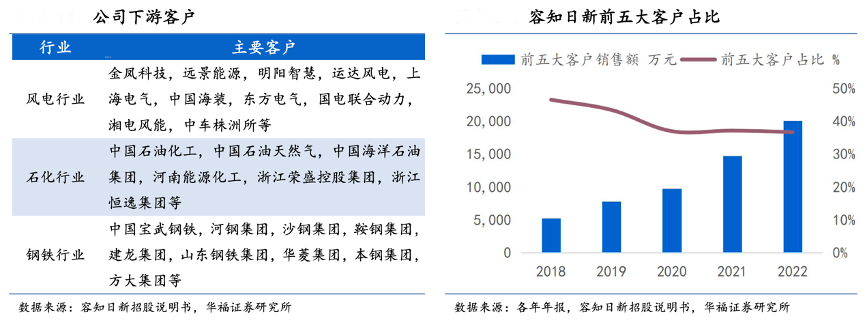 經(jīng)典案例:根據(jù)容知日新招股說明書、各年年報、華福證券研究所等綜合資訊表明,容知日新經(jīng)過十多年的發(fā)展,積累了一批優(yōu)質客戶,與風電、石化、鋼鐵等行業(yè)的多個大型知名企業(yè)或其下屬子公司保持了良好的合作關系。金風科技系風電行業(yè)新增風機吊裝容量排名第一的企業(yè),2018-2020 年來自該客戶的銷售收入占公司總營收比例分別為 15.01%/17.98%/9.72%,系公司第一大客戶。