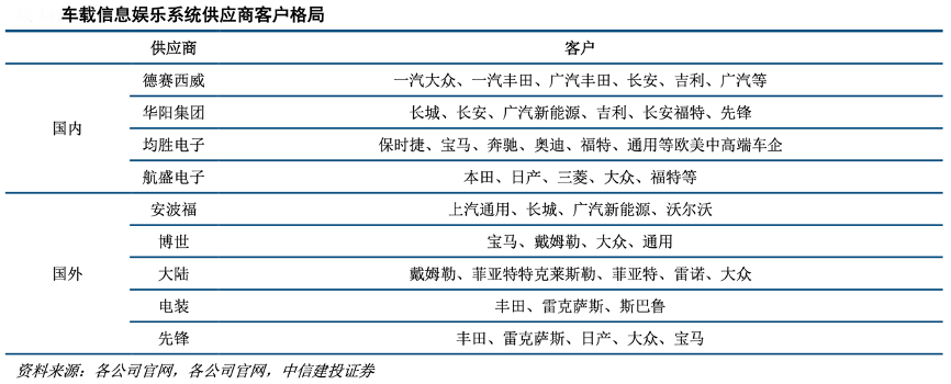 經(jīng)典案例:根據(jù)各公司官網(wǎng)、中信建投證券等綜合資訊表明,中控國內(nèi)格局“一超多強(qiáng)”,華陽屬于國內(nèi)第一梯隊。華陽集團(tuán)車載娛樂信息系統(tǒng)國產(chǎn)替代速度稍慢于德賽西威,但仍處于國內(nèi)第一梯隊,目前以 長城汽車為基本盤,積極向長安、吉利、廣汽等優(yōu)勢自主拓展。