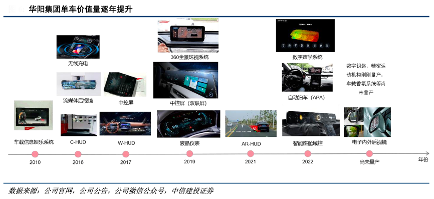 經(jīng)典案例:根據(jù)公司公告、公司官網(wǎng)、公司微信公眾號、中信建投證券等綜合資訊表明,華陽從車機到中控屏/液晶儀表再到 HUD,座艙產(chǎn)品不斷拓展提升單車價值量。2022年華陽量產(chǎn)了智能座艙域控,實現(xiàn)了中控的升級,搭載于長城的哈弗 H6 和坦克 300。同年,華陽還量產(chǎn) 了數(shù)字聲學、數(shù)字鑰匙和精密運動機構等產(chǎn)品。