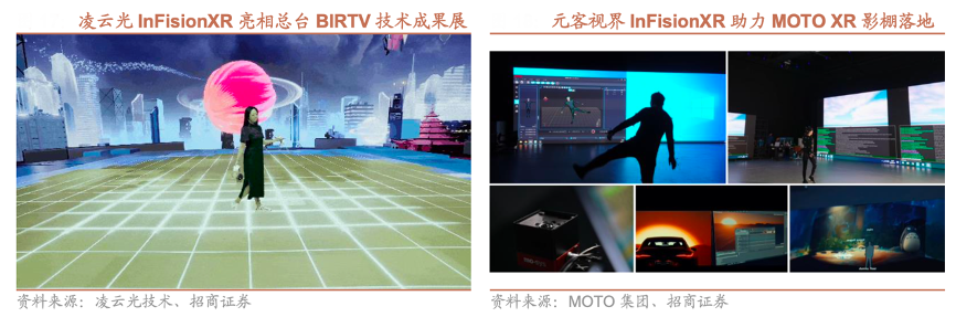 經(jīng)典案例:根據(jù)凌云光技術(shù)、MOTO集團(tuán)、招商證券等綜合資訊表明,InFision XR 是基于總臺(tái) 4K 超高清電視技術(shù)標(biāo)準(zhǔn)和 XR 虛實(shí)融合制作標(biāo)準(zhǔn)推出的“全國(guó)產(chǎn)超高清 XR 虛實(shí)融合制作系統(tǒng)”。在第三十屆北京國(guó)際廣播電影電視展覽會(huì)上,總臺(tái)聯(lián)合凌云光·元客視界將 VR 影像繪畫技術(shù)與 XR 虛實(shí)融合制作系統(tǒng)巧妙結(jié)合,該系統(tǒng) 實(shí)現(xiàn)了 VR 設(shè)備實(shí)時(shí)渲染、攝像機(jī)實(shí)景拍攝跟蹤到大屏端合成效果呈現(xiàn),打通了 廣電級(jí) VR 實(shí)時(shí)繪制的直播流程。