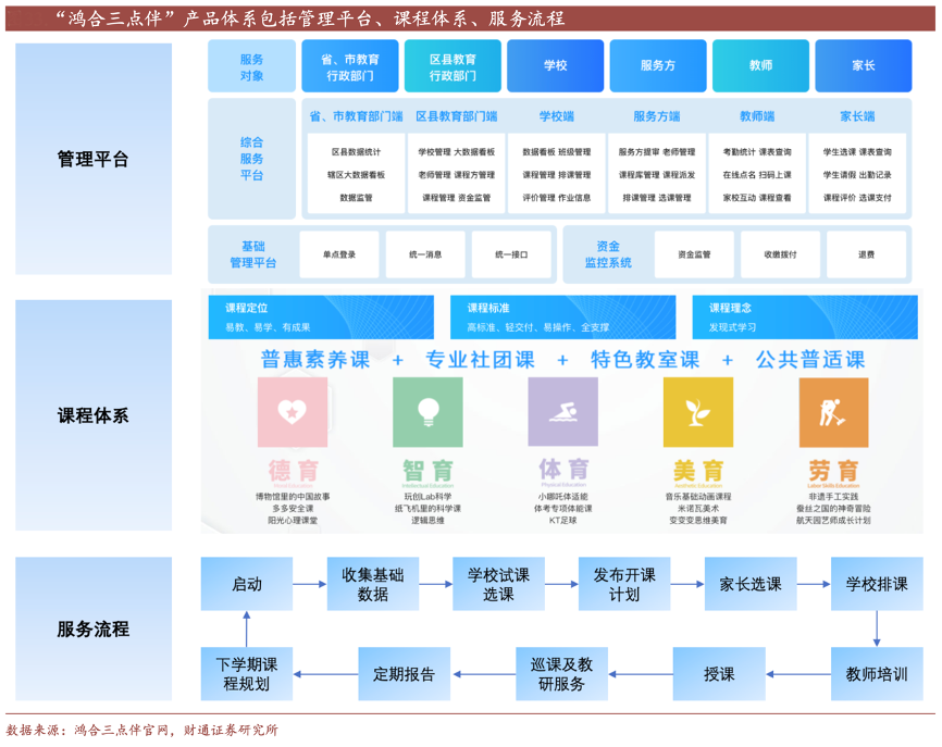 經(jīng)典案例:根據(jù)鴻合三點(diǎn)伴官網(wǎng)、財(cái)通證券研究所等綜合資訊表明,鴻合科技公司面向 K12 階段推出“鴻合三點(diǎn)伴”課后服務(wù)業(yè)務(wù),為管理部門、學(xué)校、家長(zhǎng)、老師、服務(wù)機(jī)構(gòu)提供規(guī)范管理、高效運(yùn)營(yíng)的云平臺(tái),以及“德、智、體、美、勞”五育并舉所需要的優(yōu)質(zhì)稀缺性課程,同時(shí)為客戶提供標(biāo)準(zhǔn)化、精細(xì)化的課后運(yùn)營(yíng) 服務(wù)。