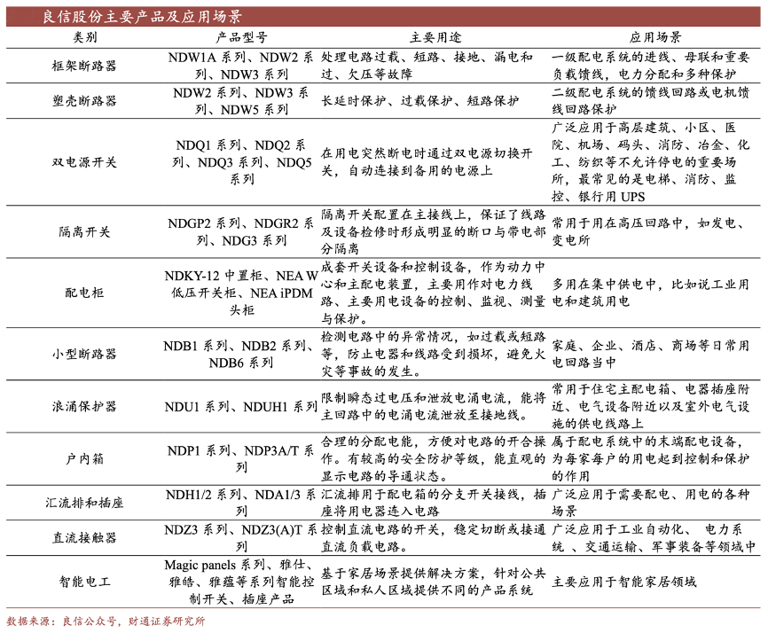 經(jīng)典案例:根據(jù)良信公眾號(hào)、財(cái)通證券研究所等綜合資訊表明,良信股份低壓電器產(chǎn)品種類齊全,下游覆蓋板塊廣泛。公司產(chǎn)品主要包括框架斷路器、塑殼斷路器、雙電源開關(guān)、隔離開關(guān)、終端類產(chǎn)品、工控類產(chǎn)品、配電柜等低壓電器以及部分中壓產(chǎn)品,業(yè)務(wù)覆蓋地產(chǎn)、通信、新能源、電網(wǎng)、工業(yè)制造等多個(gè)下游板塊。