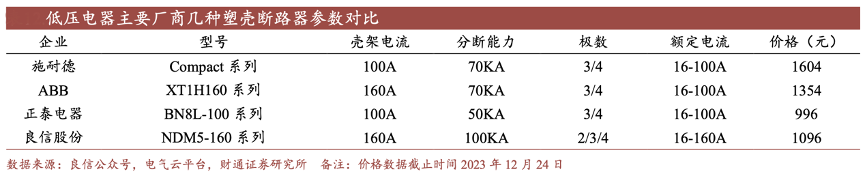 經(jīng)典案例:根據(jù)良信公眾號(hào)、電氣云平臺(tái)、財(cái)通證券研究所等綜合資訊表明,對(duì)比低壓電器行業(yè)中主流的企業(yè),發(fā)現(xiàn)相較于外資企業(yè),良信股份在同類型的產(chǎn)品中更具性價(jià)比。得益于近年來生產(chǎn)水平的不斷提升,良性產(chǎn)品的性能也與施耐德等廠商相差無幾。