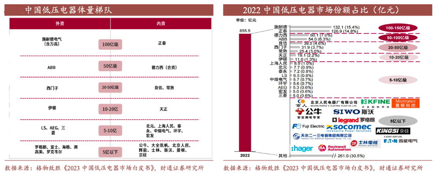 經(jīng)典案例:根據(jù)格物致勝《2023中國低壓電器市場白皮書》、財通證券研究所等綜合資訊表明,以正泰電器、良信股份為代表的內(nèi)資企業(yè),在地產(chǎn)、工業(yè) OEM 等領(lǐng)域繼續(xù)搶占外資市場份額,進(jìn)一步壓縮中小品牌外資企業(yè)市場空間。施耐德電氣作為傳統(tǒng)的外資強(qiáng)勢品牌,通過能效管理和數(shù)字化在眾多下游行業(yè)賽道固守自己的領(lǐng)域和份額。