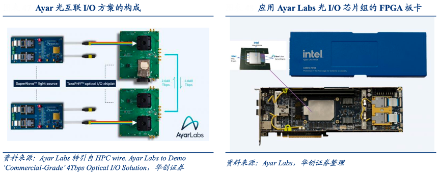 經(jīng)典案例:根據(jù)Ayar Labs、華創(chuàng)證券等綜合資訊表明, 2023 年 11 月,Ayar Labs 展出集成了英特爾 Agilex FPGA 技術(shù) 的封裝內(nèi)光學(xué) I/O 解決方案,TeraPHY 芯片和 F-tile 芯片及 FPGA 共同封裝。Ayar Labs 表示相較于市場競品該方案帶寬提高了 5 倍,功耗降低了 5 倍,延遲降低了 20 倍。