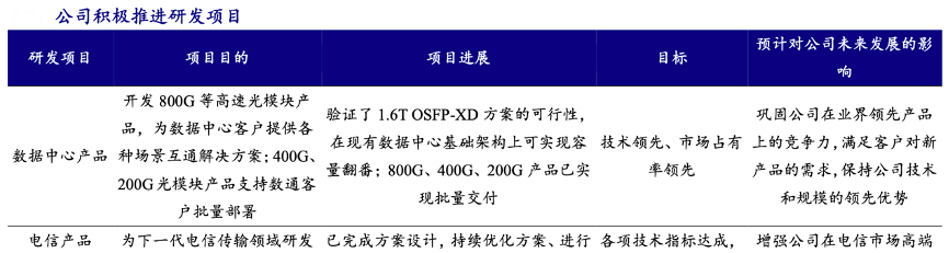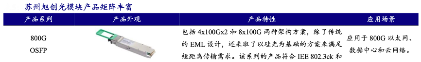 經(jīng)典案例:根據(jù)公司年報(bào)、開(kāi)源證券研究所等綜合資訊表明,蘇州旭創(chuàng)致力于高端光通信收發(fā)模 塊的研發(fā)、設(shè)計(jì)、封裝、測(cè)試和銷(xiāo)售,產(chǎn)品服務(wù)于云計(jì)算數(shù)據(jù)中心、數(shù)據(jù)通信、 5G 無(wú)線網(wǎng)絡(luò)、電信傳輸和固網(wǎng)接入等領(lǐng)域的國(guó)內(nèi)外客戶(hù)。公司注重技術(shù)研發(fā),并推動(dòng) 產(chǎn)品向高速率、小型化、低功耗、低成本方向發(fā)展,為云數(shù)據(jù)中心客戶(hù)提供 100G、 200G、400G 和 800G 的高速光模塊。