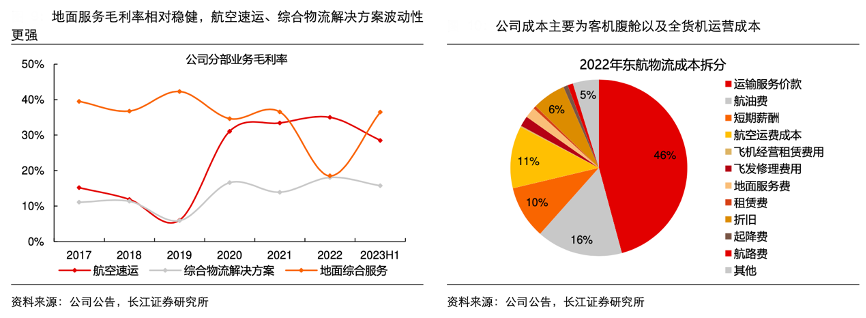 經(jīng)典案例:根據(jù)公司公告、長江證券研究所等綜合資訊表明,東航物流公司從毛利率看,因航空速運、綜合物流解決方案承擔空運干線運輸,利潤跟隨運價波動,盈利周期性較強,2020 年以來,航空速運、綜合物流毛利率維持在較高水平。地面綜合服務(wù)以貨站收入為主,公司卡位布局核心貨站資源,穩(wěn)定賺機場貨量增長的錢,毛利率通常穩(wěn)定維持在 35%以上。