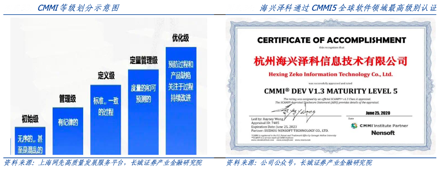 經(jīng)典案例:根據(jù)上海網(wǎng)先高質(zhì)量發(fā)展服務(wù)平臺(tái)、公司公眾號(hào)、長(zhǎng)城證券產(chǎn)業(yè)金融研究院等綜合資訊表明,在軟件開(kāi)發(fā)方面,海興電力全資子公司杭州海興澤科信息技術(shù)有限公司已獲得國(guó)家重點(diǎn)軟件企業(yè)認(rèn)定,并于 2020 年獲得國(guó)際軟件成熟度模型最高級(jí)別 CMMI-5 級(jí)認(rèn)證,是行業(yè)內(nèi)極少數(shù)可面向全球市場(chǎng)提供高質(zhì)量軟件集成服務(wù)的企業(yè),標(biāo)志著公司在技術(shù)研發(fā)能力等方面達(dá)到了國(guó)際頂級(jí)水平。