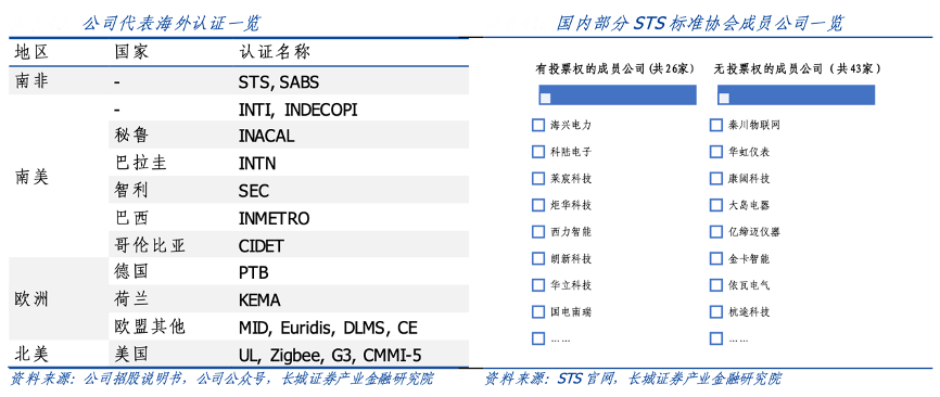經(jīng)典案例:根據(jù)公司招股說明書、公司公眾號(hào)、STS官網(wǎng)、長(zhǎng)城證券產(chǎn)業(yè)金融研究院等綜合資訊表明,海興電力獲得了多個(gè)國(guó)際認(rèn)證,其中包括 德國(guó) PTB 認(rèn)證、歐盟 MID 認(rèn)證等各種國(guó)際常規(guī)認(rèn)證,是國(guó)內(nèi)最早成功研制 ANSI 美國(guó)標(biāo)準(zhǔn)系列產(chǎn)品的企業(yè)之一、是國(guó)內(nèi)最早成功研發(fā)歐洲智能電表標(biāo)準(zhǔn)的企業(yè)之一、也是我國(guó)獲得國(guó)際認(rèn)證較多的智能電表企業(yè)之一。同時(shí),2017 年海 興參與全球工人的預(yù)付費(fèi)系統(tǒng)開放標(biāo)準(zhǔn)——國(guó)際 STS 標(biāo)準(zhǔn)的制定,Vending 系統(tǒng)成功通 過 STS 認(rèn)證測(cè)試,成為國(guó)內(nèi)首家 STS 最新標(biāo)準(zhǔn)的 Vending 系統(tǒng)廠家,進(jìn)一步夯實(shí)了其在海外市場(chǎng)的美譽(yù)。