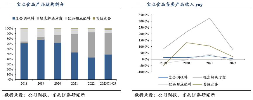 經(jīng)典案例:根據(jù)公司財報、東吳證券研究所等綜合資訊表明,寶立公司主營業(yè)務分為復調(diào)、輕烹解決方案和飲品甜點配料。2021 年公司收購廚房阿芬 75%股份后,空刻意面業(yè)務并入輕烹解決方案收入。復調(diào)和輕烹業(yè)務現(xiàn)在系公司收入兩大基石,2023Q1-3 復調(diào)、輕烹業(yè)務收入占比分別為 49%/43%。