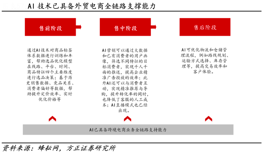 經(jīng)典案例:根據(jù)蜂耘網(wǎng)、方正證券研究所等綜合資訊表明,較其他距消費者較遠的領(lǐng)域,電商直接觸達終端消費,AI 應用場景簡單直接。且電商天然擁有大量數(shù)據(jù),AI可迅速完整被訓練,更快提供適配性服務(wù)。目前 AI麥可已能做到賦能電商全鏈路,實現(xiàn) 售前、售中、售后的智能化管理運營。