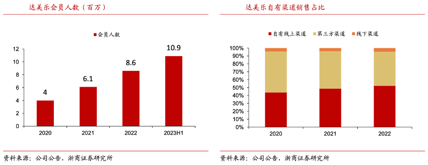 經(jīng)典案例:根據(jù)公司公告、浙商證券研究所等綜合資訊表明,達(dá)美樂打造專有消費(fèi)者數(shù)據(jù)平臺(tái),其已建立專有 CDP 跟蹤客戶的特定需求與偏好,基于消費(fèi)者洞察,進(jìn)行針對性的推新和營銷。此外,顧客可以在自有渠道(網(wǎng)站、小程序和 APP 等)加入會(huì)員計(jì)劃,只有在自有渠道(22 年銷售占比 52%)的訂單才能獲得積分獎(jiǎng)勵(lì),進(jìn)一步培養(yǎng)了顧客的消費(fèi)習(xí)慣,2023 年上半年會(huì)員數(shù)增長至 10.9 百萬。