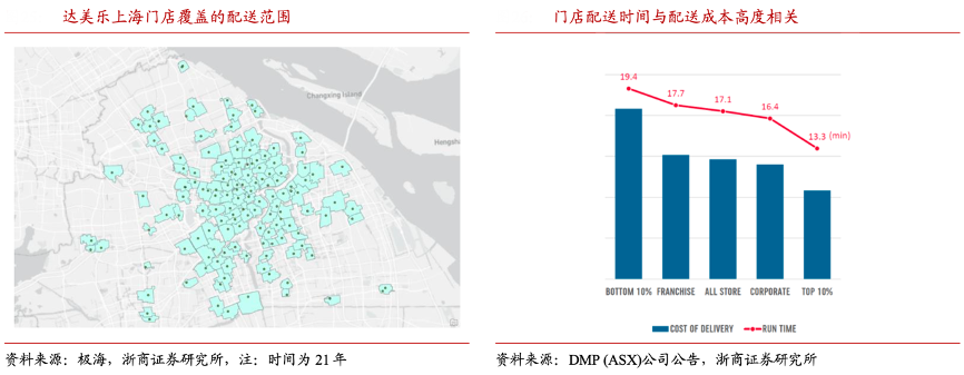 經(jīng)典案例:根據(jù)極海、DMP(ASX)公司公告、浙商證券研究所等綜合資訊表明,達(dá)美樂為了實(shí)現(xiàn) 30 分鐘必達(dá)承諾,其在擴(kuò)張門店網(wǎng)絡(luò)時(shí),確保 門店的配送區(qū)域覆蓋至高密度的住宅及商業(yè)區(qū),同時(shí)積極優(yōu)化門店的配送半徑提升外送效率。根據(jù)極海品牌監(jiān)測,達(dá)美樂選址采用平鋪方式,在北京和上海城市門店已經(jīng)基本覆蓋主要區(qū)域。