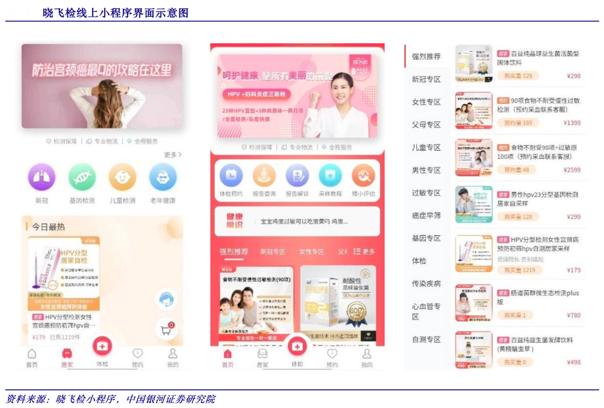 經(jīng)典案例:根據(jù)曉飛檢小程序、中國銀河證券研究院等綜合資訊表明,迪安診斷“曉飛檢”將醫(yī)院檢驗(yàn)科搬到線上,增強(qiáng)醫(yī)檢服務(wù)終端觸達(dá)。目前曉飛檢在微信小程序商城、支付寶醫(yī)療健康、天貓、京東等線上渠道開放預(yù)約,實(shí) 現(xiàn)“線上預(yù)約下單-線下就近采血點(diǎn)采血-線上一鍵查收?qǐng)?bào)告”全鏈路操作的打通。