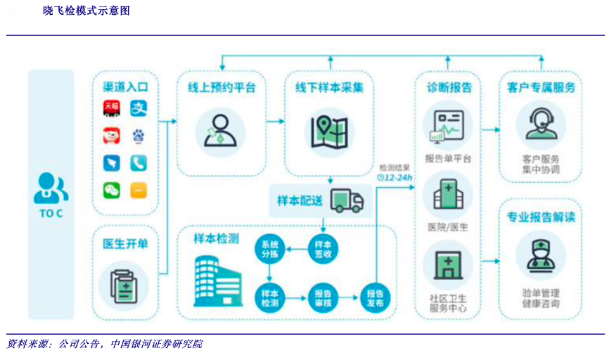 經(jīng)典案例:根據(jù)曉飛檢小程序、中國(guó)銀河證券研究院等綜合資訊表明,迪安診斷“曉飛檢”將醫(yī)院檢驗(yàn)科搬到線上,增強(qiáng)醫(yī)檢服務(wù)終端觸達(dá)。目前曉飛檢在微信小程序商城、支付寶醫(yī)療健康、天貓、京東等線上渠道開放預(yù)約,實(shí) 現(xiàn)“線上預(yù)約下單-線下就近采血點(diǎn)采血-線上一鍵查收?qǐng)?bào)告”全鏈路操作的打通。