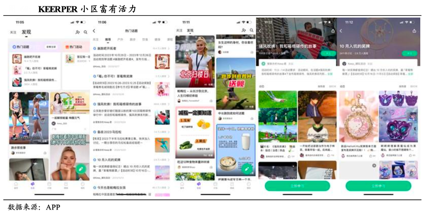 經(jīng)典案例:根據(jù)APP、國泰君安證券研究等綜合資訊表明,KEEP 平臺擁有中國最大的在線健身用戶群,圍繞健身建立小區(qū)是其對核心健身體驗的有力補(bǔ)充,使其具有更強(qiáng)的激勵作用、更激烈的競技感及更緊密的相互聯(lián)系。2022 年 Keeper 小區(qū)的互動(包括帖子、點(diǎn)贊和評論)總數(shù)達(dá) 11 億次。