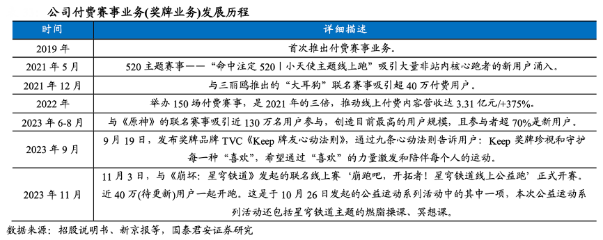 經(jīng)典案例:根據(jù)招股說明書、新京報、國泰君安證券研究等綜合資訊表明,KEEP公司自 2019 年推出付費(fèi)賽事業(yè)務(wù),2021 年起該業(yè)務(wù)與各知名 IP 聯(lián)名推出獎牌,推動迅猛發(fā)展。近兩年來,公司在 IP 聯(lián)名上頻繁出擊,如與海綿寶寶、大耳狗、蠟筆小新、櫻桃小丸子、史努比、小劉鴨、甄嬛傳等知名 IP 推出獎牌業(yè)務(wù);且獎牌設(shè)計和傳統(tǒng)馬拉松獎牌不同,包括鏤空、立體或特殊形狀設(shè)計。