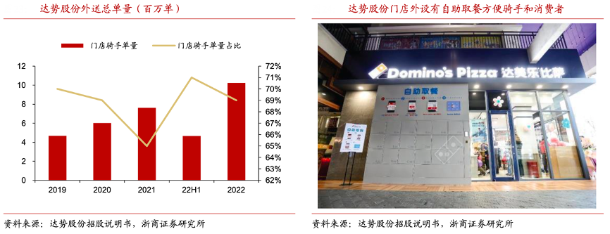 經(jīng)典案例:根據(jù)達(dá)勢(shì)股份招股說(shuō)明書(shū)、浙商證券研究所等綜合資訊表明,達(dá)美樂(lè)中國(guó)區(qū)別于其他比薩品牌,其依靠獨(dú)家配備的專業(yè)騎手來(lái)完成外送訂單,專業(yè)騎手常駐門(mén)店,并且僅配送公司門(mén)店訂單從而避免交叉污染,確保食品安全。同時(shí)通其進(jìn)一步加強(qiáng)了公司 30 分鐘必達(dá)承諾的能力。