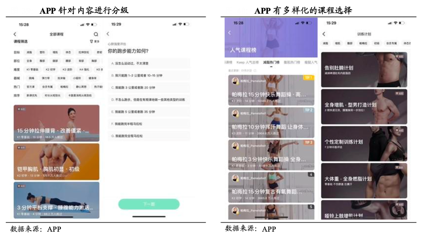 經(jīng)典案例:根據(jù)APP、國(guó)泰君安證券研究等綜合資訊表明,KEEP平臺(tái)提供的內(nèi)容可分為:1)錄制的結(jié)構(gòu)化課程,是在標(biāo)準(zhǔn)化背 景下拍攝的健身動(dòng)作的剪輯組合;2)公司、達(dá)人或其他內(nèi)容提供商 開(kāi)發(fā)的錄播課;3)直播課;4)分享健身知識(shí)的文章和短視頻。