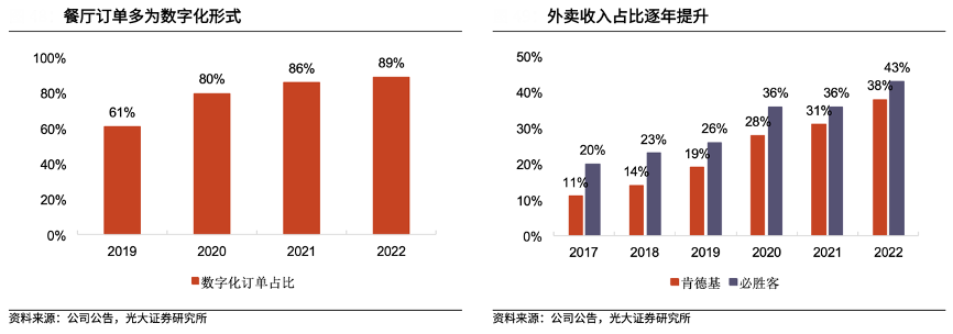 經(jīng)典案例:根據(jù)公司公告、光大證券研究所等綜合資訊表明,數(shù)字化訂單拓展餐廳營業(yè)的時空概念,也為進(jìn)一步提升運營能力提供海量數(shù)據(jù)基礎(chǔ)。2019 年,百勝中國公司數(shù)字化訂單占比為61%,受到新冠疫情的影響,2020 年占比擴大至 80%,后續(xù)進(jìn)一步提升至 2021 年的 86%和 2022 年的 89%。其2022 年,肯德基和必勝客 外賣收入占比分別為 38%和 43%。