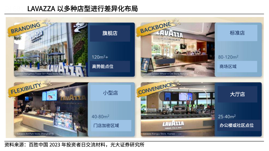 經(jīng)典案例:根據(jù)百勝中國2023年投資者日交流材料、光大證券研究所等綜合資訊表明,2023年百勝中國公司門店模型已迭代至2.5代,對門店設(shè)計、消費者體驗以及成本結(jié)構(gòu)進(jìn)行進(jìn)一步優(yōu)化。針對不同點位,公司擁有多種店型進(jìn)行布局,門店具有較強的靈活性。