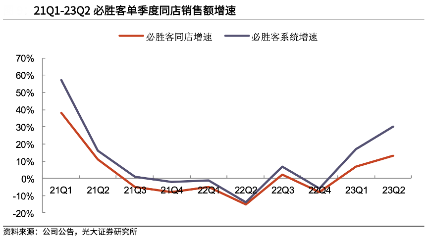 經(jīng)典案例:根據(jù)公司公告、光大證券研究所等綜合資訊表明,2018 年 12 月必勝客在全國范圍內(nèi)推 出“尖叫星期三”長期優(yōu)惠活動(dòng),在每周三都給予特定產(chǎn)品優(yōu)惠的價(jià)格, 品類包括牛排、披薩、甜品等。2020年必勝客在“30 周年”之際推出經(jīng) 典產(chǎn)品 9 元起、半價(jià)過“五一”等活動(dòng)。2023年為慶祝開業(yè) 3000 家店,必勝客連續(xù) 5 天推出“69 元兩件產(chǎn)品”。隨著防疫政策逐步優(yōu)化,23Q1 以來必勝客單季度同店銷售額增速持續(xù)回升。