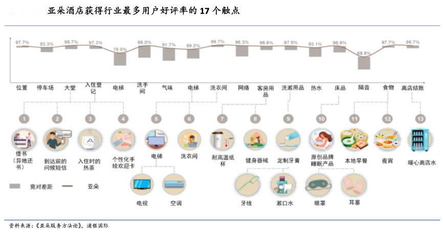 經(jīng)典案例:根據(jù)《亞朵服務(wù)方法論》、浦銀國(guó)際等綜合資訊表明,亞朵在消費(fèi)者入住過(guò)程中植入了多個(gè)標(biāo)準(zhǔn)以上的服務(wù)觸點(diǎn),讓消費(fèi)者感受到貼心的服務(wù)和物超所值的消費(fèi)體驗(yàn)。這些與消費(fèi)者的接觸點(diǎn)是在提供標(biāo)準(zhǔn)化的服務(wù)之余,融入了為客戶著想的巧思。