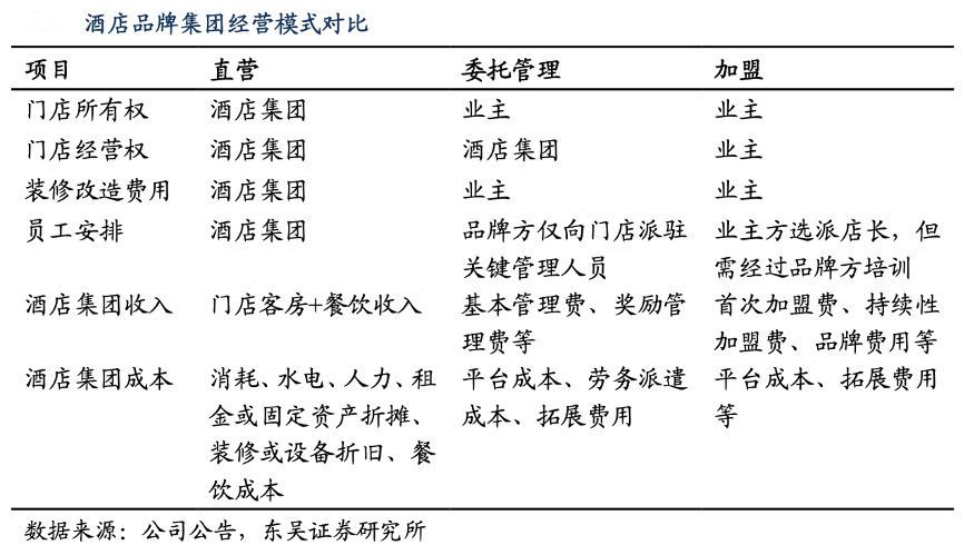 經(jīng)典案例:根據(jù)公司公告、東吳證券研究所等綜合資訊表明,直營模式下,君亭公司擁有門店的所有權(quán)和經(jīng)營權(quán),而加盟模式下,酒店品牌不直接負責酒店的管理和運營,授權(quán)業(yè)主方使用品牌、管理體系、數(shù)字化平臺等,業(yè)主方掌握所有權(quán)和經(jīng)營權(quán),承擔相應(yīng)風險,酒店集團收取首次加盟費、持續(xù)加盟費、品牌費用等。