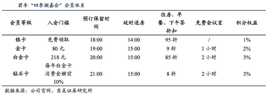 經(jīng)典案例:根據(jù)公司官網(wǎng)、東吳證券研究所等綜合資訊表明,會員體系方面,君亭酒店“四季瀾嘉會”會員體系已基本建 成,會員等級分為銀卡、金卡、白金卡以及鉆石卡,在預(yù)定、退房以及折扣權(quán)益方面給予不同優(yōu)惠。憑借完善的會員體系,為公司積累大量忠誠客戶,截至 2023 年 11 月,會員總數(shù)已達 570 萬。