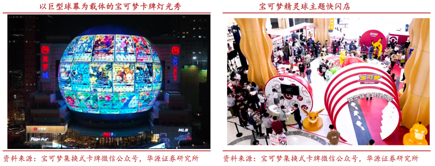 經(jīng)典案例:根據(jù)寶可夢(mèng)集換式卡牌游戲微信公眾號(hào)、華源證券研究所等綜合資訊表明,2023 年 3 月 18 日,寶可夢(mèng)精靈球巨型球幕燈光秀空降靜安大悅城,寶可夢(mèng)卡牌精靈球主題快閃店也于 3 月 31 日開(kāi)始在上海靜安大悅城舉辦。2023 年 5 月 16 日,寶可夢(mèng)(上海)與上海圖書(shū)館聯(lián)合主辦 “開(kāi)卷有夢(mèng)——互動(dòng)閱讀推廣系列活動(dòng)”,包括為期兩個(gè)月的“寶可夢(mèng)卡牌原畫(huà)交互藝術(shù)展”和持續(xù)一年的主題性“閱讀推廣親子道館”,共計(jì)展出 50 位以上插畫(huà)師的近 200 幅原畫(huà)作品。