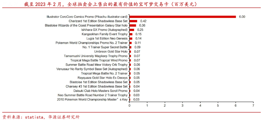 經(jīng)典案例:根據(jù)statista、華源證券研究所等綜合資訊表明,初版的《游戲王》卡牌或經(jīng)典的《寶可夢》卡牌,由于其年代久遠且產(chǎn)量有限,再加上在歷史上重要的比賽中出現(xiàn)過,這些卡牌在市場上極具收藏和投資價值。這種投資需求直接推動了二級市場的發(fā)展,使得卡牌交易逐漸形成一個龐大的市場體系。據(jù) statista,截至 2023 年 2 月,全球拍賣會上售出的最有價值的寶可夢交易 卡為 Illustrator CoroCoro Comics Promo,拍賣單價六百萬美元。