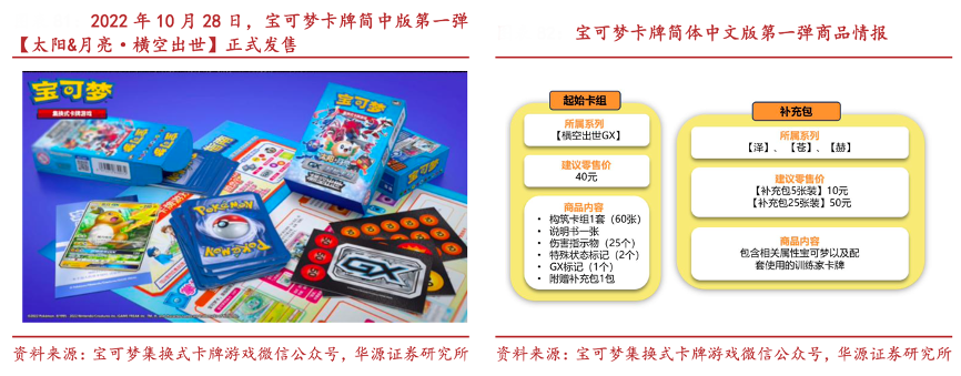 經(jīng)典案例:根據(jù)寶可夢(mèng)集換式卡牌游戲微信公眾號(hào)、華源證券研究所等綜合資訊表明,2022 年 10 月 28 日,寶可夢(mèng)卡牌簡(jiǎn)中版正式發(fā)售,是中國現(xiàn)代 TCG 開拓者和引路人。 產(chǎn)品方面,寶可夢(mèng)卡牌簡(jiǎn)中版第一彈推出了面向新手玩家的起始卡組【橫空出世 GX】以及【赫】、 【蒼】、【澤】3 款補(bǔ)充包。起始卡組備齊了對(duì)戰(zhàn)所需的基礎(chǔ)物品,即買即玩,補(bǔ)充包則包 含更多的高罕卡牌以及閃卡等。