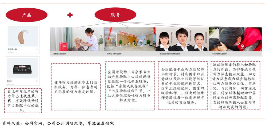 經(jīng)典案例:根據(jù)公司官網(wǎng)、公司公開調(diào)研紀(jì)要、華源證券研究等綜合資訊表明,可孚設(shè)立“聽力驗(yàn)配中心”,通過產(chǎn)品+服務(wù)為患者提供一站式聽力解決方案。2018 年,可孚通過健耳聽力在全國開設(shè)直營聽力驗(yàn)配中心,門店設(shè)有專業(yè)驗(yàn)配師,會根據(jù)聽損患者的聽力損失情況和自我需求,為其提供專業(yè)的助聽器產(chǎn)品、聽力康復(fù)方案、助聽器驗(yàn)配調(diào) 試、助聽器保養(yǎng)以及持續(xù)的售后服務(wù),為患者提供一站式的聽力解決方案。