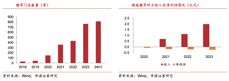 經(jīng)典案例:根據(jù)wind、華源證券研究等綜合資訊表明,近年健耳聽力門店布局加速,由 2020 年的 149 家快速增長至 24H1 的 814 家,連鎖網(wǎng)絡(luò)覆蓋全國 20 個省級市場、128 個地級市場,并在湖南、 四川、廣西、湖北等區(qū)域?qū)崿F(xiàn)高密度布局。