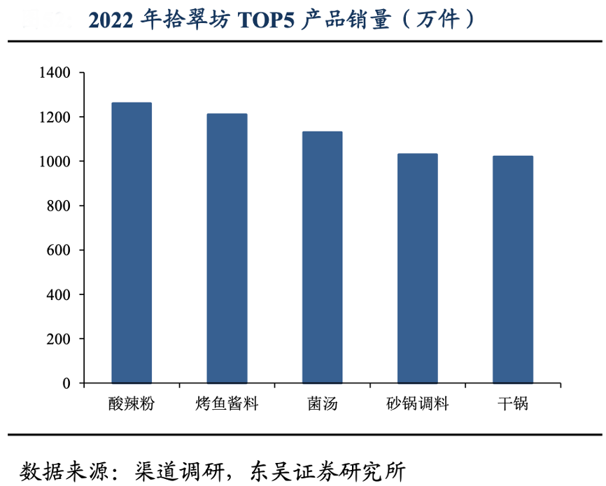 經(jīng)典案例:根據(jù)渠道調(diào)研、東吳證券研究所等綜合資訊表明,考慮到復(fù)調(diào)產(chǎn)品的長尾屬性,食萃在產(chǎn)品研發(fā)方面采取跟隨策略,每年篩選市場中活躍度較高的品類,基于豐富的客戶體驗(yàn)反饋數(shù)據(jù)進(jìn)行產(chǎn)品配方優(yōu)化調(diào)整,提高產(chǎn)品開發(fā)效率。2022年食萃共有酸辣粉、烤魚醬料、菌湯、砂鍋調(diào)料、干鍋等 5 個(gè)千 萬級(jí)大單品。