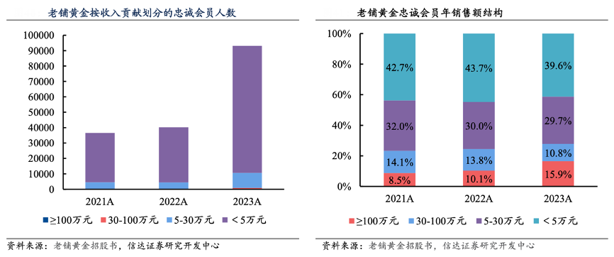 經(jīng)典案例:根據(jù)老鋪黃金招股書(shū)、信達(dá)證券研究開(kāi)發(fā)中心等綜合資訊表明,老鋪黃金忠誠(chéng)會(huì)員人數(shù)快速增長(zhǎng),高級(jí)別會(huì)員銷售貢獻(xiàn)持續(xù)提升。2023年,在老鋪黃金購(gòu)買至少一次的忠誠(chéng)會(huì)員人數(shù)翻倍以上增長(zhǎng),達(dá)到 9.3 萬(wàn)人,同比增幅 131%。其中,年消費(fèi)額 100 萬(wàn) 元及以上的忠誠(chéng)會(huì)員貢獻(xiàn)了公司 15.9%的收入,這一比例從 2021 年的 8.5%逐年提升至 2023 年的 15.9%。