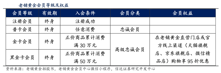 經(jīng)典案例:根據(jù)老鋪黃金招股書、老鋪黃金會(huì)員中心微信小程序、信達(dá)證券研究開發(fā)中心等綜合資訊表明,老鋪黃金公司會(huì)員分為四大等級,任意消費(fèi)即可成為忠誠會(huì)員,累計(jì)正價(jià)商品消費(fèi)金額達(dá)到 30 萬元 即為高級忠誠會(huì)員,可享受官方購買渠道 95 折的優(yōu)惠權(quán)益。