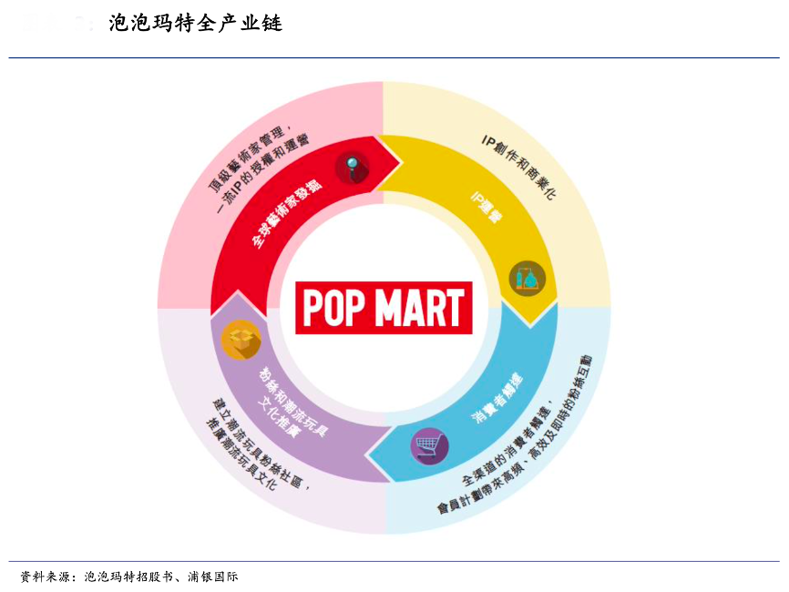 經(jīng)典案例:根據(jù)泡泡瑪特招股書、浦銀國(guó)際等綜合資訊表明,作為中國(guó)最大的平臺(tái)型潮玩 IP 企業(yè),泡泡瑪特是目前少數(shù)參與藝術(shù)家 IP 早 期孵化和培育過程,并覆蓋 IP 全產(chǎn)業(yè)鏈的潮玩玩家。