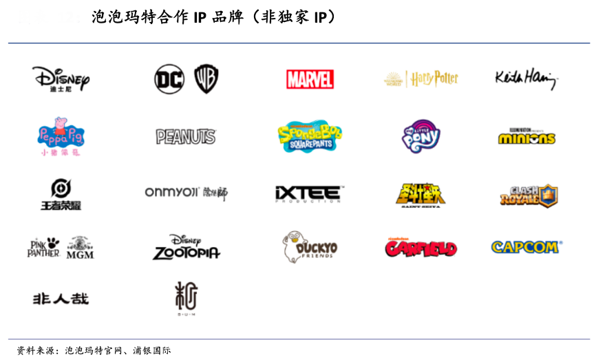 經(jīng)典案例:根據(jù)泡泡瑪特官網(wǎng)、浦銀國(guó)際等綜合資訊表明,泡泡瑪特在潮玩行業(yè)的巨大影響力以及在盲盒細(xì)分賽道絕對(duì)的領(lǐng)先地位,也吸引了眾多知名的 IP 品牌運(yùn)營(yíng)商授權(quán)泡泡瑪特進(jìn)行產(chǎn)品設(shè)計(jì)和開發(fā),用以擴(kuò)大 IP 在中國(guó)市場(chǎng)的影響力,這促使泡泡瑪特合作品牌(即非獨(dú)家 IP)的隊(duì)伍不斷壯大。