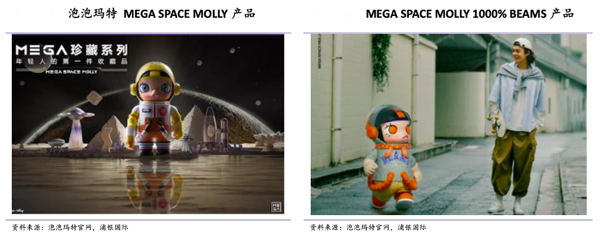 經(jīng)典案例:根據(jù)泡泡瑪特官網(wǎng)、浦銀國(guó)際等綜合資訊表明,為了推動(dòng)“潮玩藝術(shù)化”的趨勢(shì),泡泡瑪特早在 2021 年便推出了 Molly 的 高端產(chǎn)品線 MEGA 珍藏系列——「MEGA 珍藏系列 1000% SPACE MOLLY × 海綿寶寶」和「MEGA 珍藏系列 400% SPACE MOLLY × 海綿寶寶」。相較盲盒,MEGA 產(chǎn)品不僅體積更大,做工也更為精細(xì)和考究。