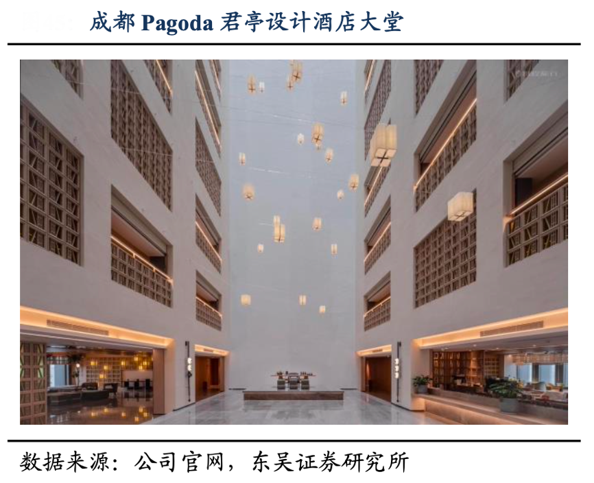 經(jīng)典案例:根據(jù)公司官網(wǎng)、東吳證券研究所等綜合資訊表明,成都 Pagoda 大堂結(jié)合現(xiàn)代 AR 交互技術(shù),展示林俊廷先生作品《鎏瑩》,中庭采用獨特孔明燈設(shè)計,營造中式設(shè)計氛圍。軟硬件配置方面,成都 Pagoda 提倡精選模式,室內(nèi)陳設(shè)最大程度契合奢侈氛圍;房間內(nèi)部均配有 熊貓玩偶,高度契合成都文創(chuàng)文化;酒店配有高端會議廳、精品餐廳、健身房等設(shè)施, 打造兼并社交與辦公的成都悠閑氛圍復(fù)合生活空間。
